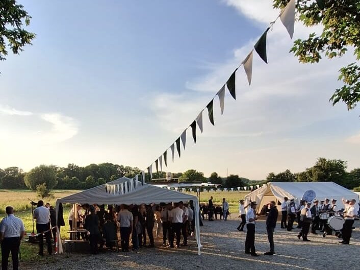 Das Bierkönigschießen ist eine öffentliche Veranstaltung und so finden sich auch Dorfbewohner ohne Schärpe ein, um das spannende Schießen zu verfolgen und einen geselligen Samstagnachmittag bis -abend zu verbringen.